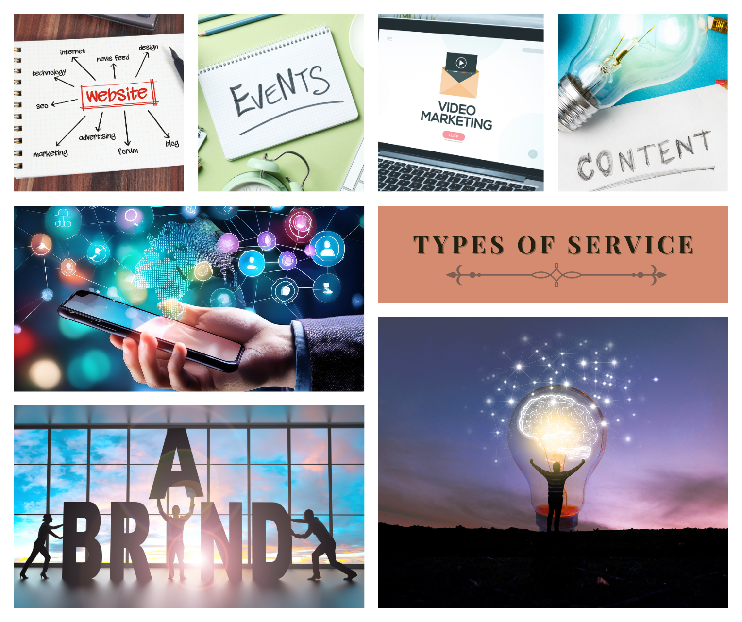 Creative Marketing: We believe in thinking outside the box and taking a fresh approach to the market.Event Branding: From product launches to conferences, we'll help you create an unforgettable brand experience that leaves a lasting impression on your attendees.Company Websites: Your website is often the first interaction customers have with your brand; we can create that for you.Engaging Social Posts: Our team of social media experts knows how to create content that engages and entertains your audience.